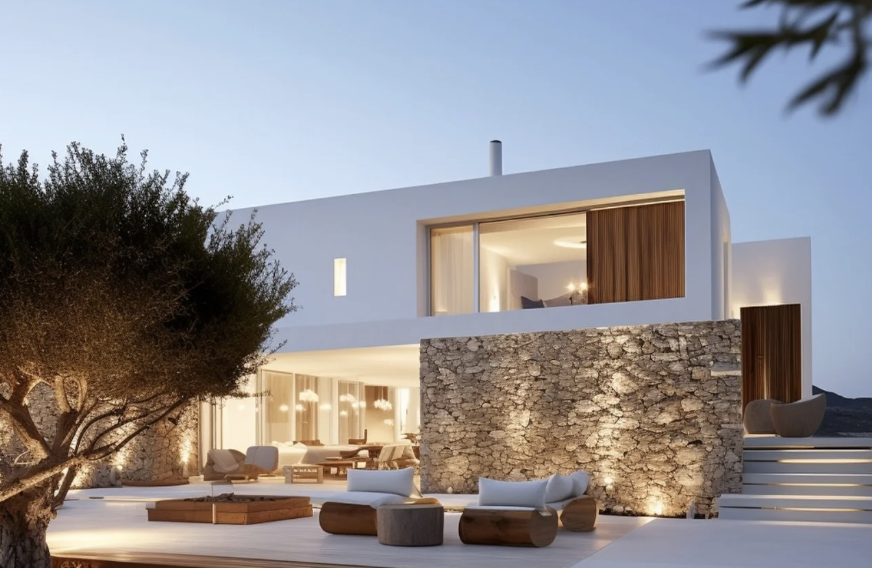 The villas blend contemporary minimalism with natural, organic materials, creating a refined yet grounded aesthetic.