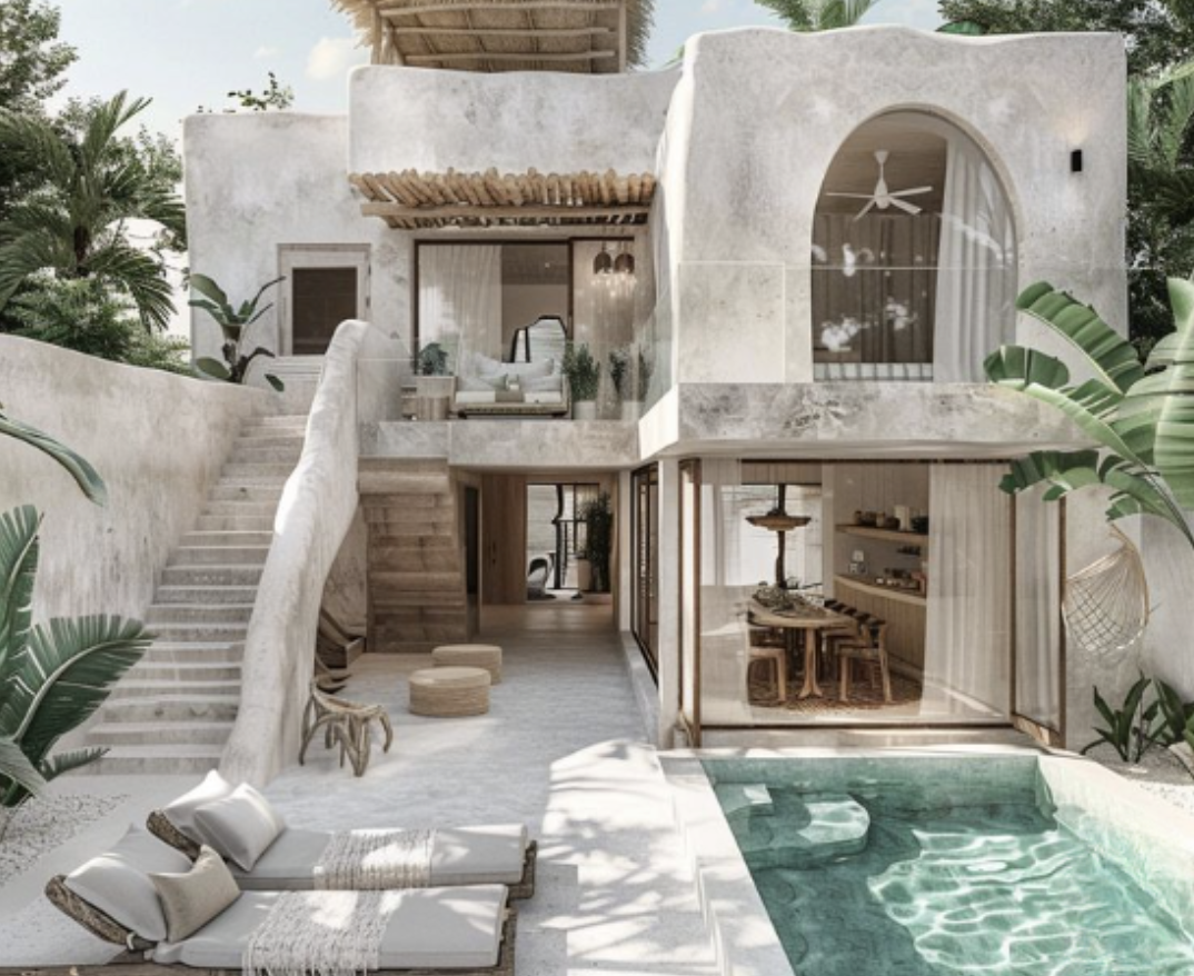 ohemian luxury meets modern comfort in this Tulum-inspired villa, blending natural textures with contemporary design.